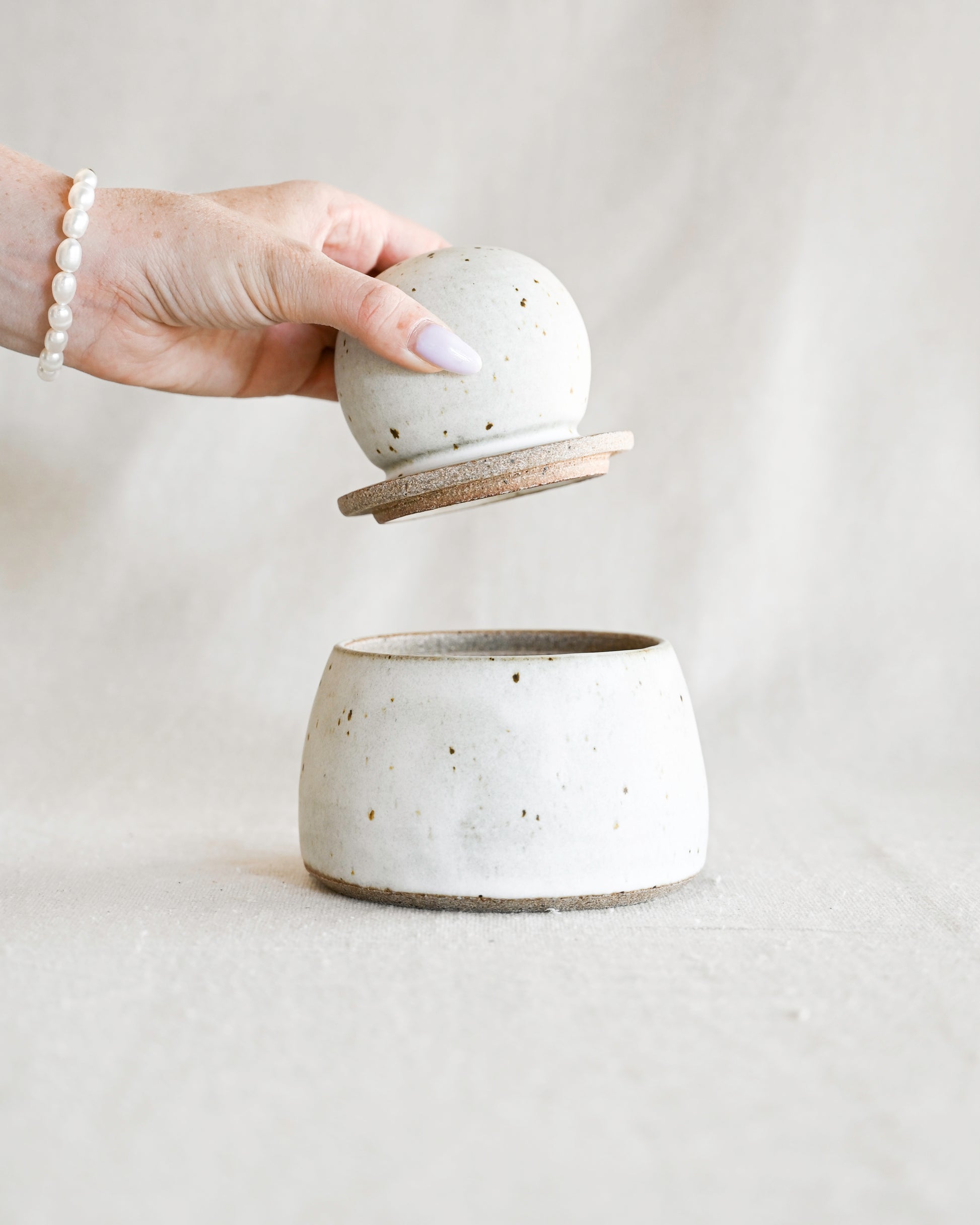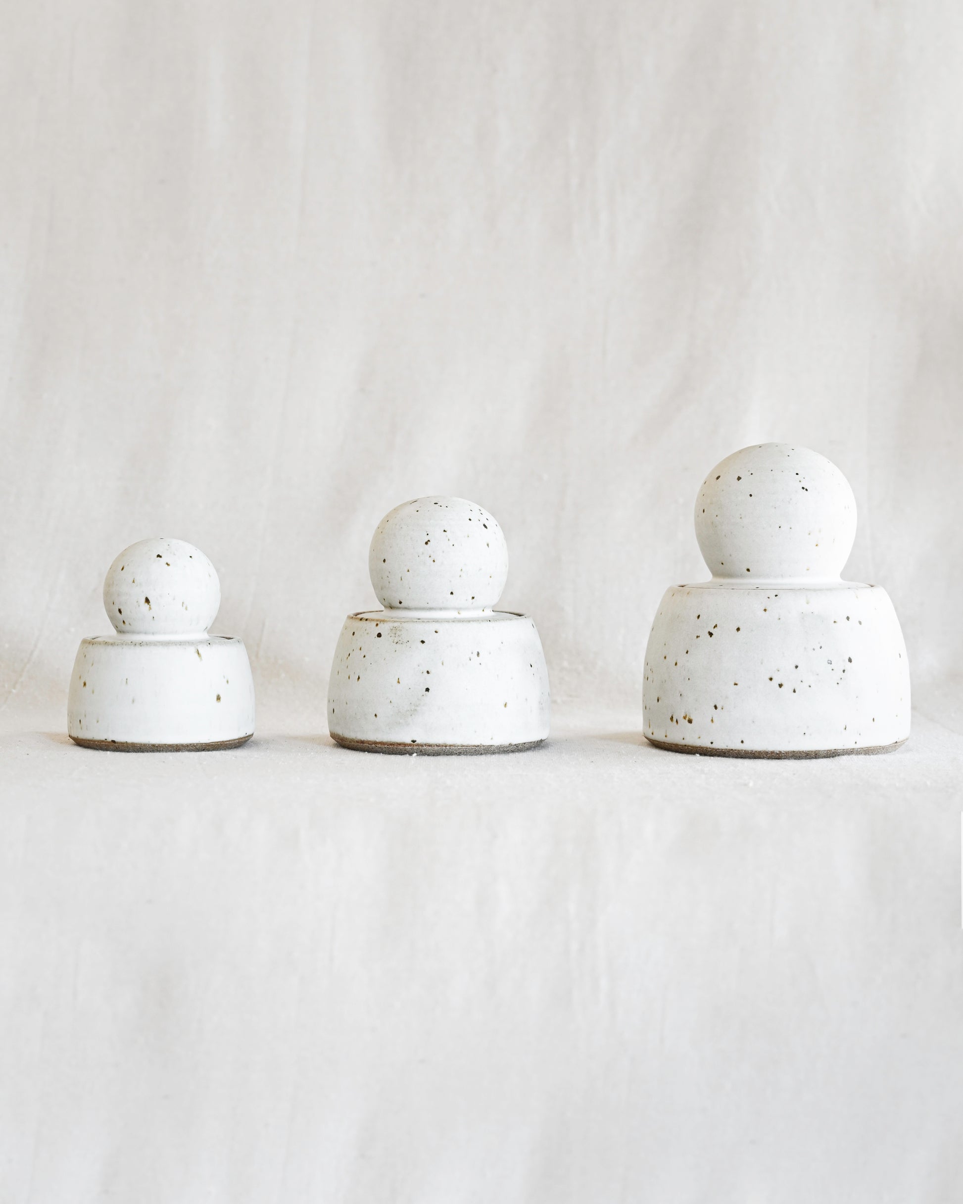 A most stylish storage solution, the beautifully crafted Stash Jar / Pot is handmade from stoneware and finished with an understated reactive matte glaze. Accented with a large round knobbed top, this striking vessel is sure to add interest and intrigue to any surface. Display on its own as a decorative object, or use to conveniently stow away your favorite bits and bobs.