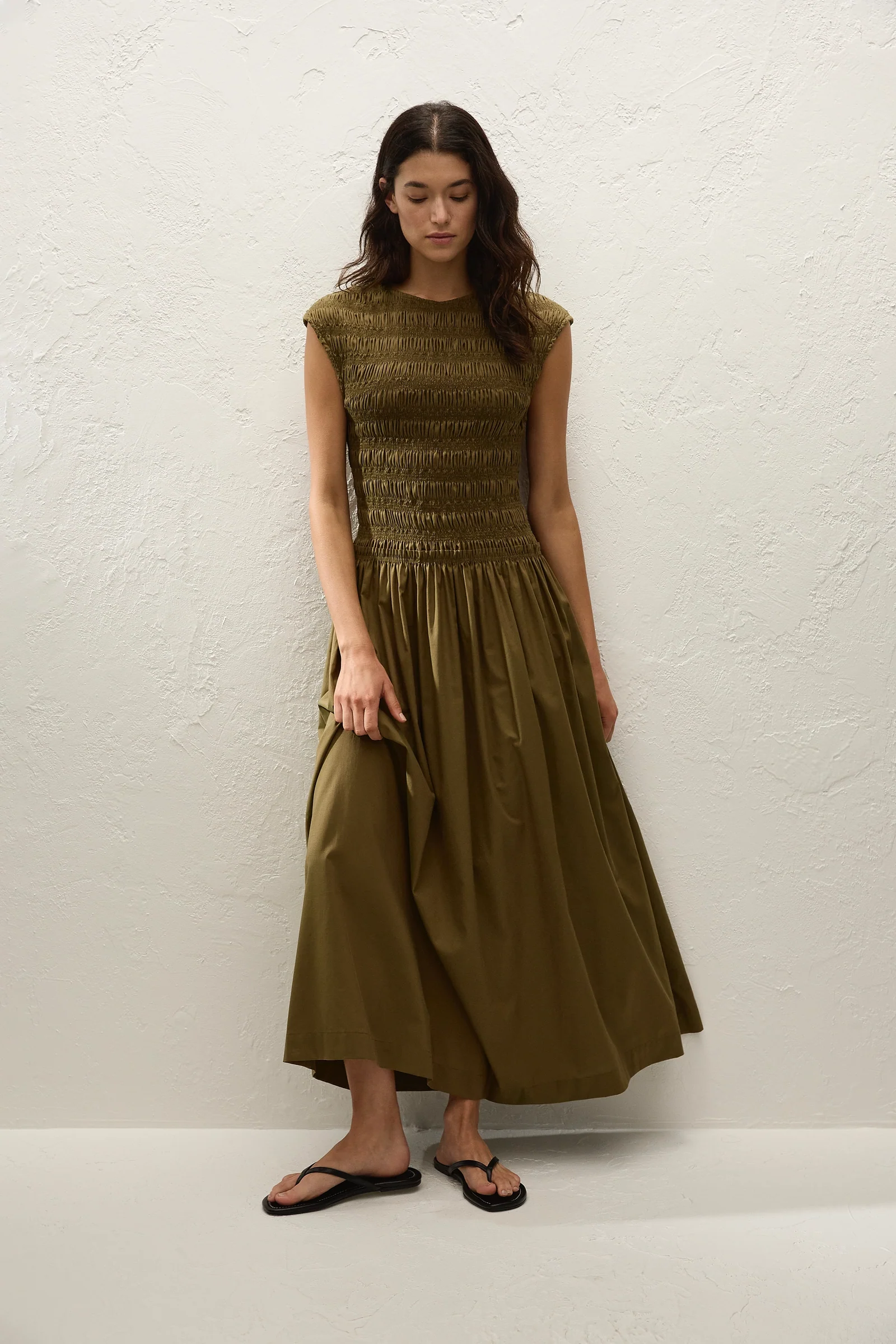 A transeasonal midi dress, designed from a signature 100% BCI Certified organic cotton in a deep shade of olive green. Shirred through the bodice with a high rounded neckline and short cap-style sleeves, there is a simple keyhole and button closure at the back neck. It is gathered through the waist for a feminine touch before flaring into a soft A-line skirt. Style with a simple sandal for everyday dressing, timeless and wearable throughout the year.