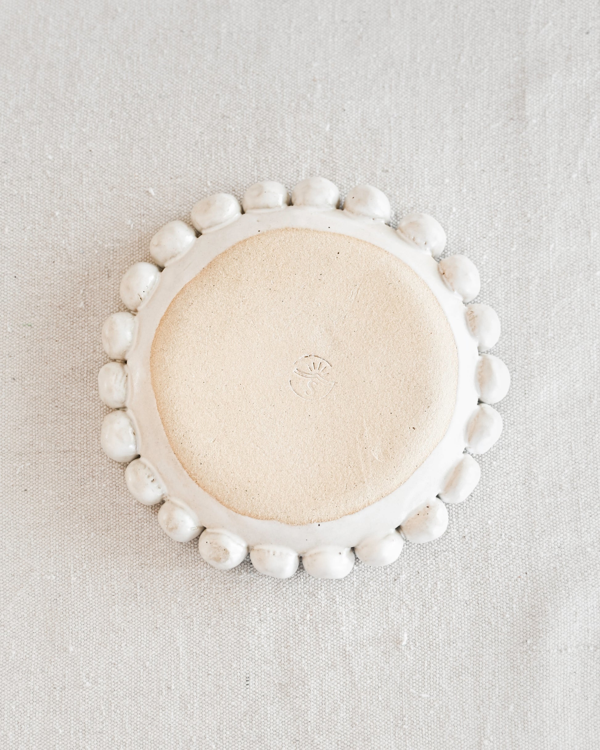 The Beaded Plate is a round serving plate with a dramatic beaded edge. It is handmade from start to finish and purposely slightly wabi sabi.
