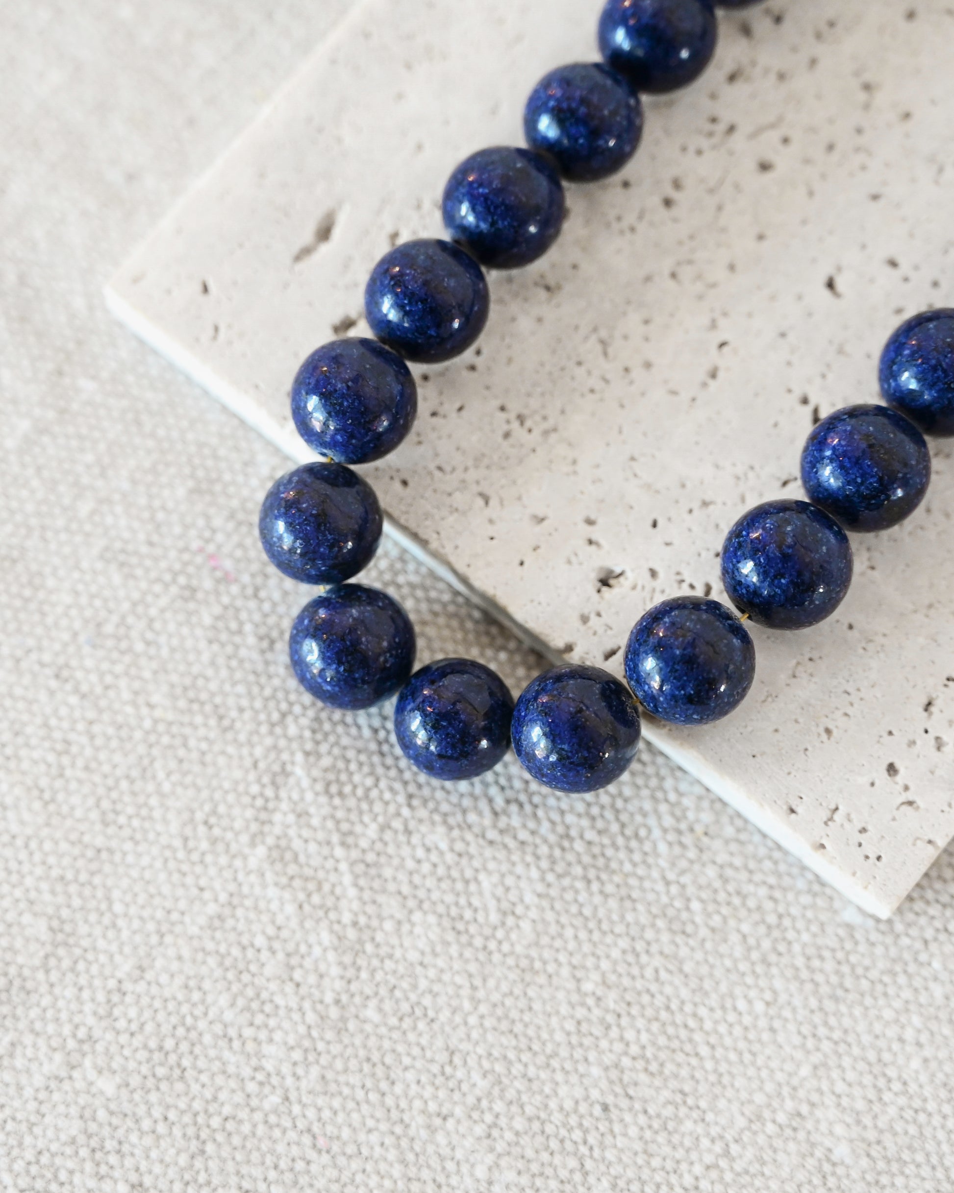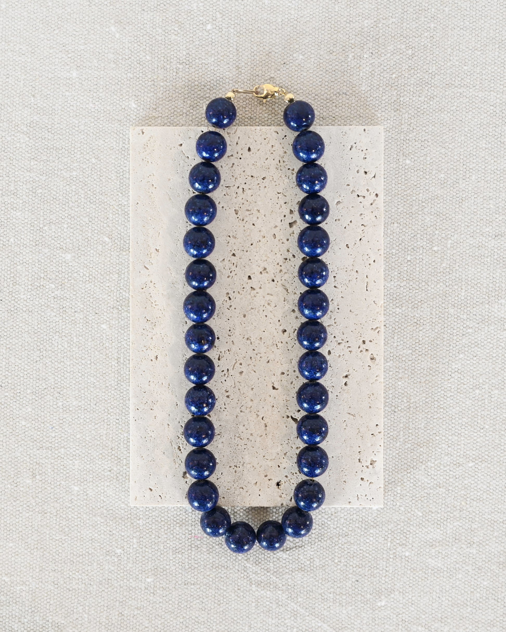 The Maris Beaded Necklace is strung from genuine lapis lazuli beads, known for their deep blue tones. Designed to be worn solo or layered, it brings a rich, luminous presence to any outfit. Crafted with smooth 10 mm beads and finished with a gold-filled clasp, this necklace measures 16 inches for a timeless collarbone fit.