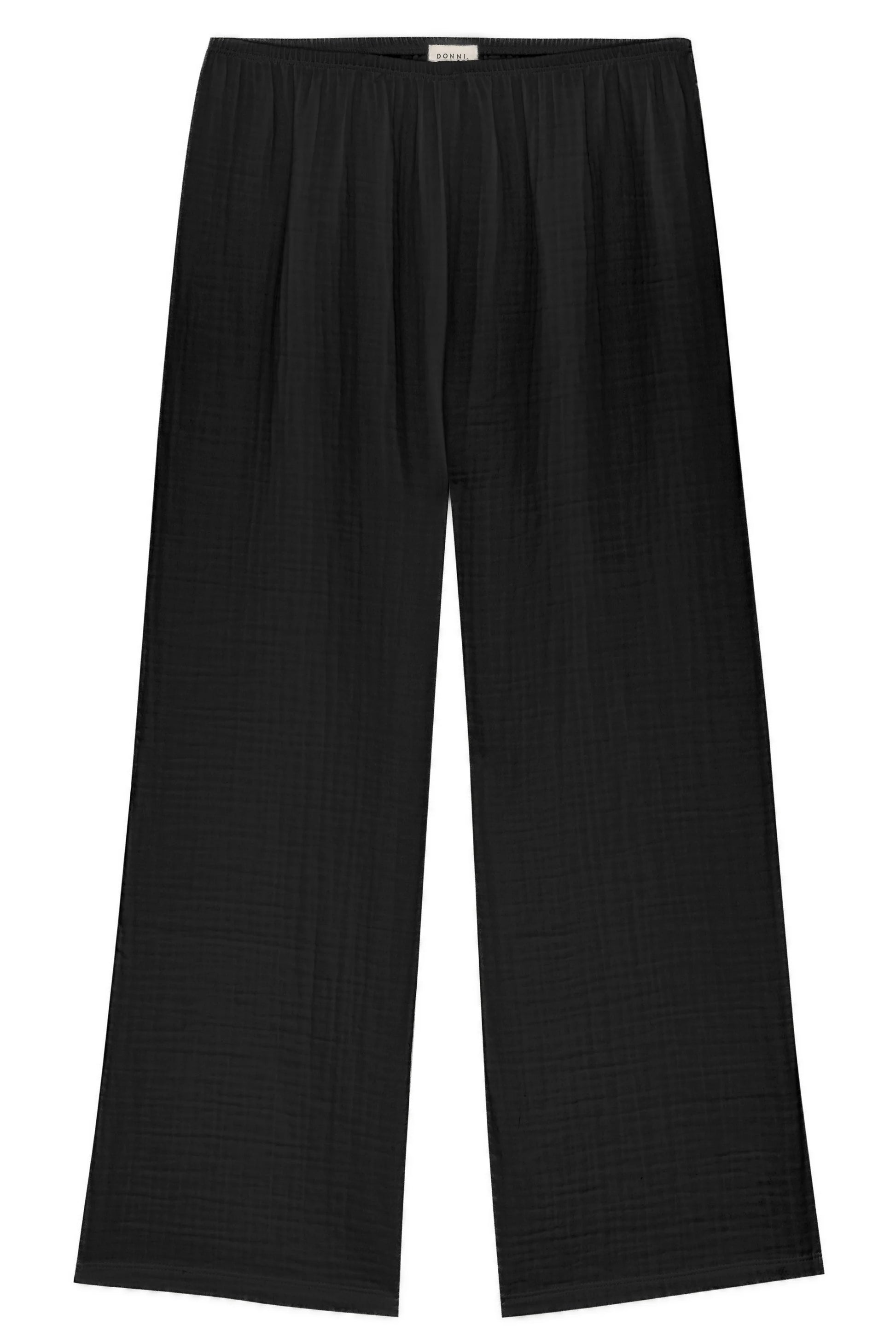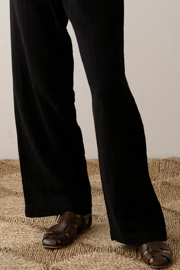 The Bubble Crop Simple Pant is crafted from ultra-soft, lightweight 100% cotton gauze and features an easy elastic waistband, cropped fit, and a gauzy texture.