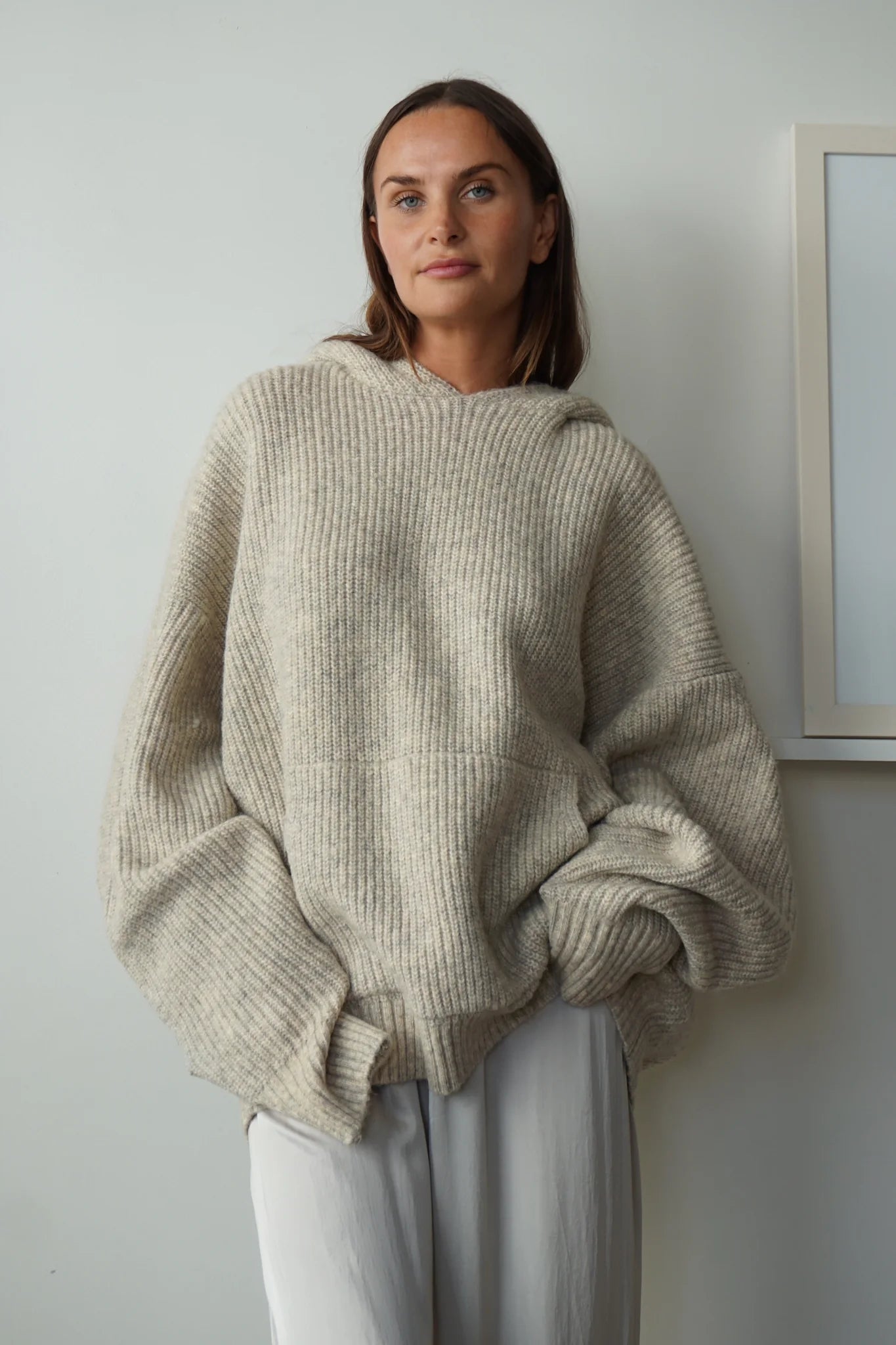 The Cloud Hoodie is an oversized knit hoodie with a kangaroo pocket front detail. It is crafted from an acrylic nylon wool blend. It is one-size-fits-all.