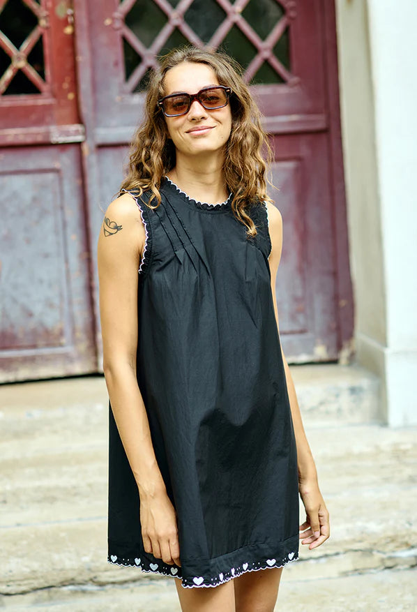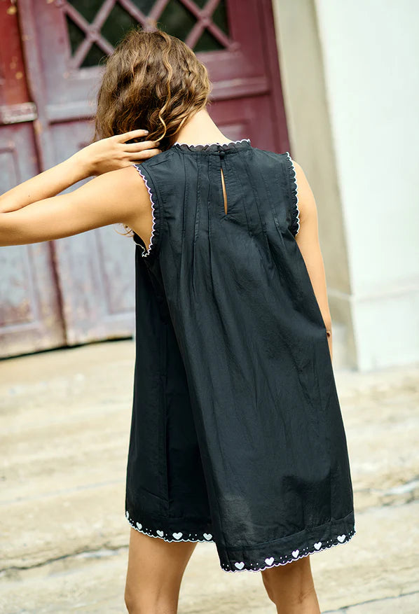 The Ebba Dress is a sleeveless cotton-silk blend mini dress featuring pleating, embroidery detail, and scalloped hemlines.