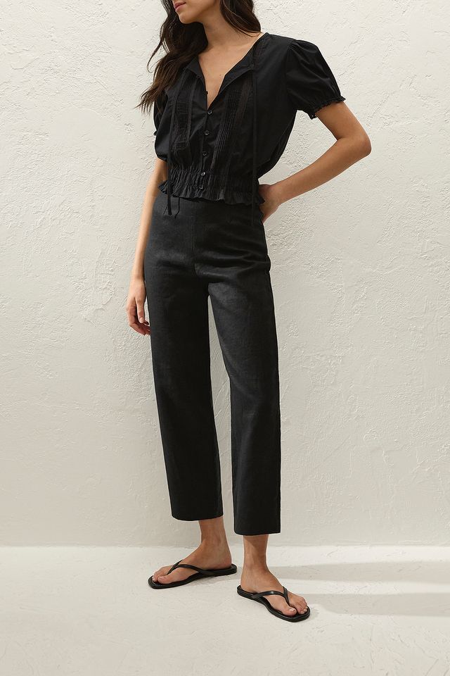 A vintage-inspired blouse, designed from a signature 100% cotton in a classic black. A feminine silhouette with short cap sleeves, elasticated at the cuff with a delicate frill detail, it has a rounded neckline that finishes with a tie detail. Lace panels are adorned down the front, alongside a simple button-up closure, while the waist is gathered and elasticated, finishing in a frill hem.