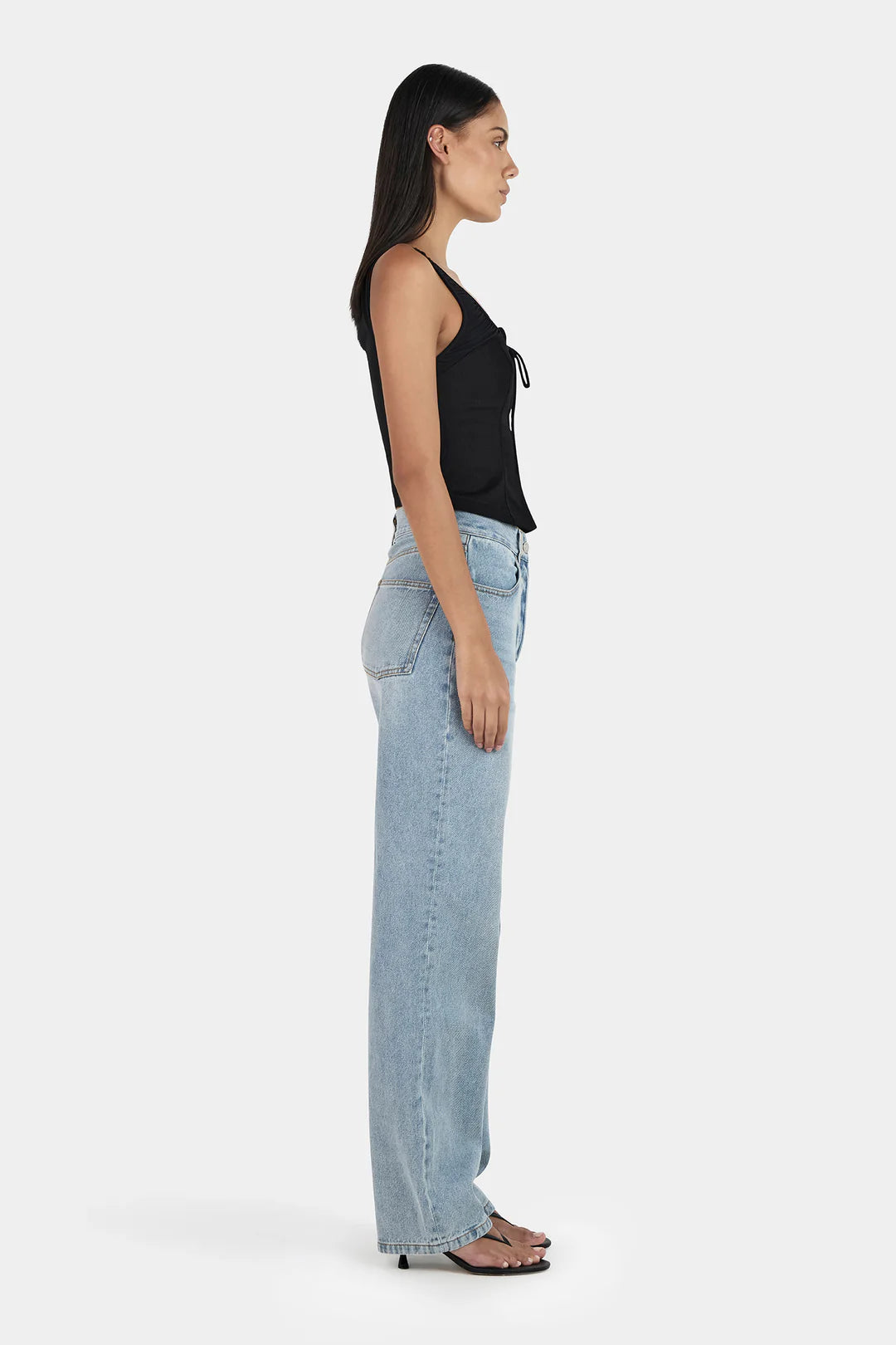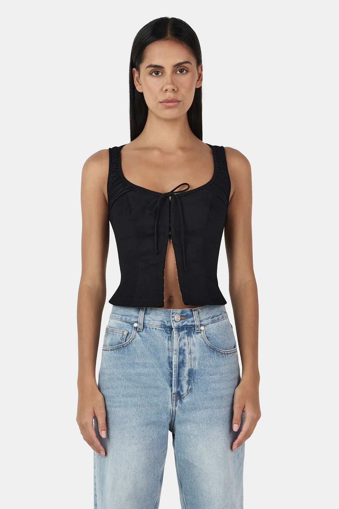 The Honey Corset Top features a contrast design with mesh panels covering the back and shoulders. Front princess seams allow for a flattering shape, while hook-and-eye closures allow the top to be worn fully fastened or slightly open.