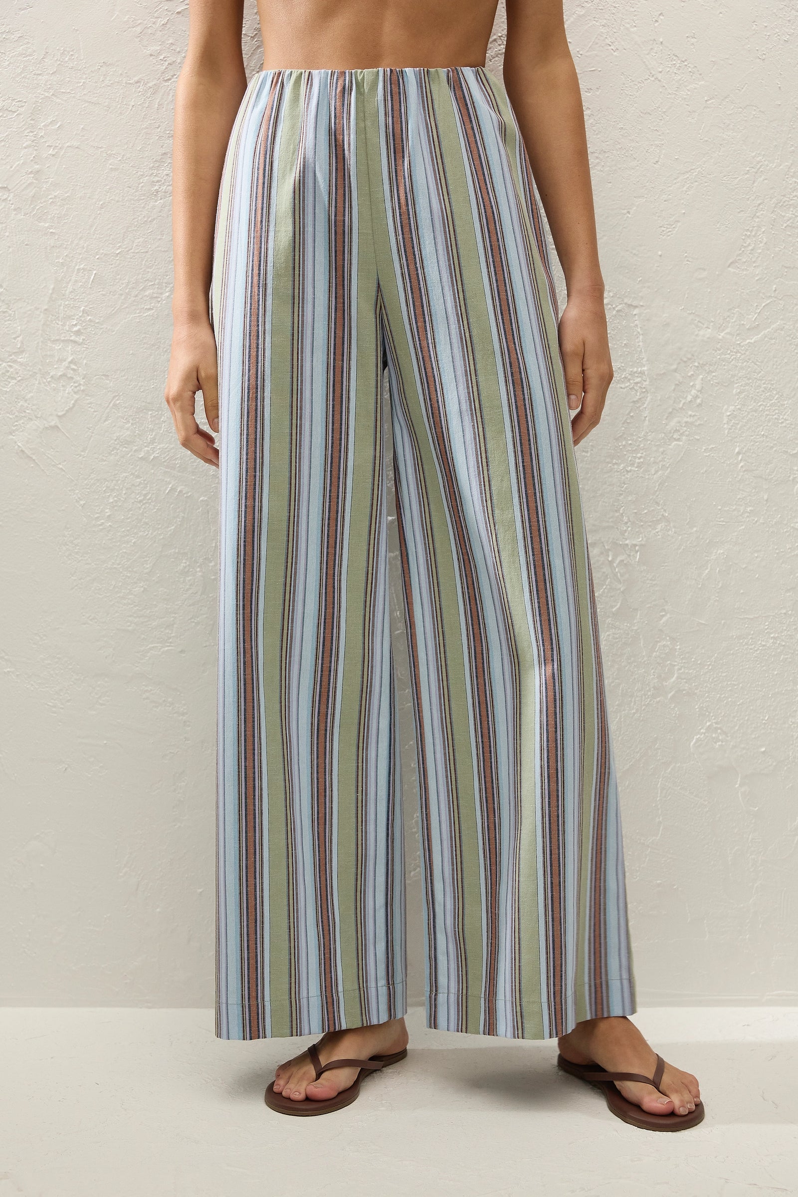 A high-rise trouser, designed from a unique cotton linen blend in a cool multi-coloured stripe, inspired by the colours of Mexico City. Sitting high above the hips with an elasticated waist and side seam pockets, they fall into a relaxed straight leg silhouette. Style with swim for easy beach-to-bar dressing.