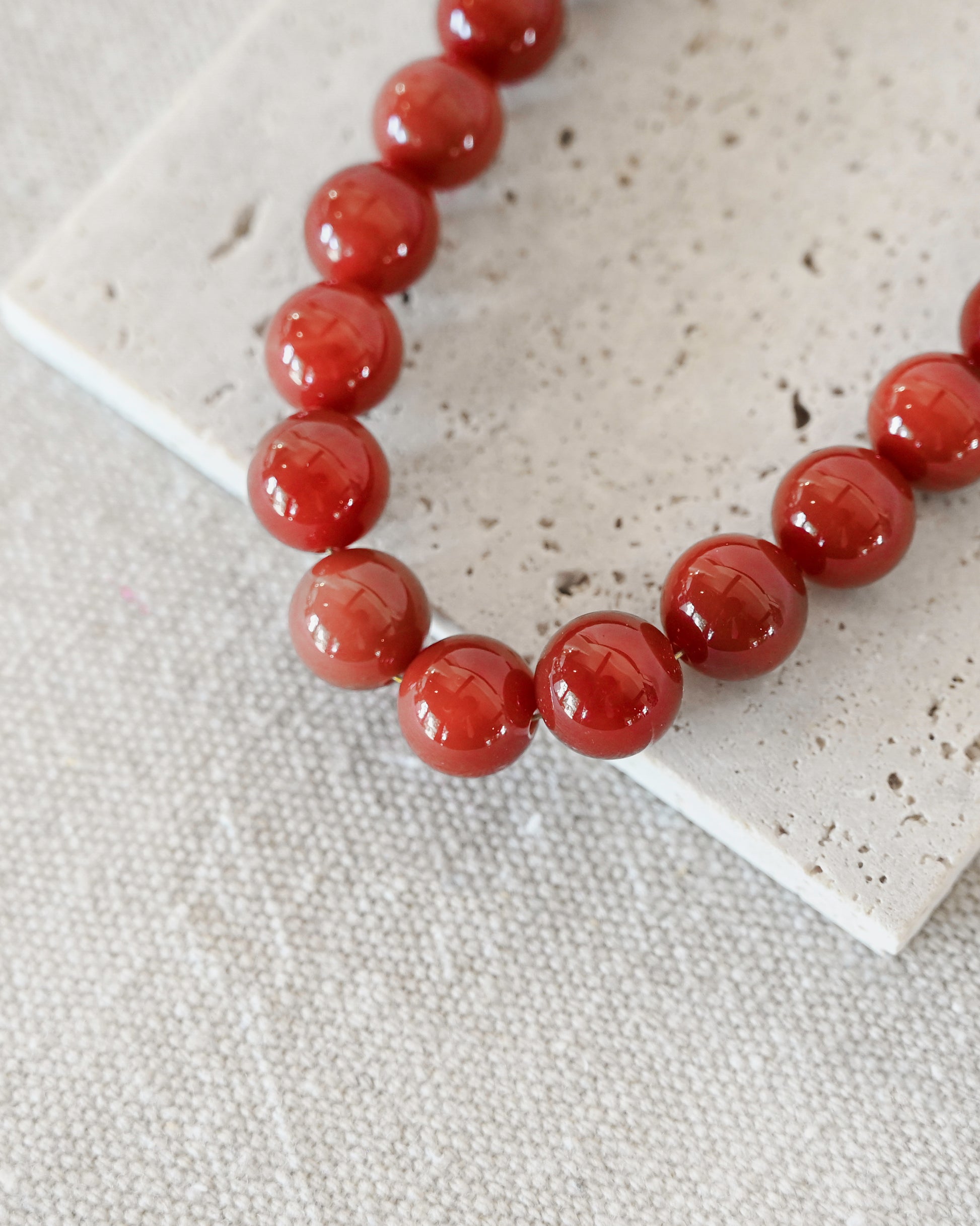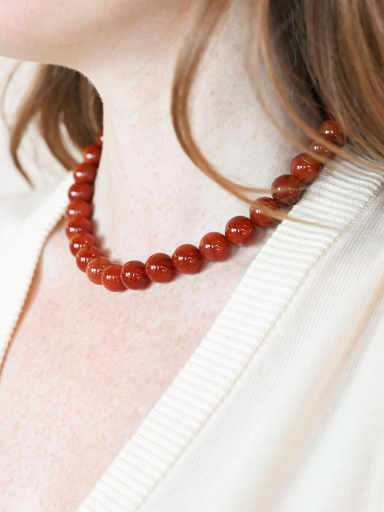 The Terra Beaded Necklace is strung from genuine red carnelian beads, known for their rich color and natural warmth. Designed to be worn solo or layered, it brings an effortless edge to any look. Crafted with smooth 10 mm beads and finished with a gold-filled clasp, this necklace measures 16 inches for a classic collarbone fit.