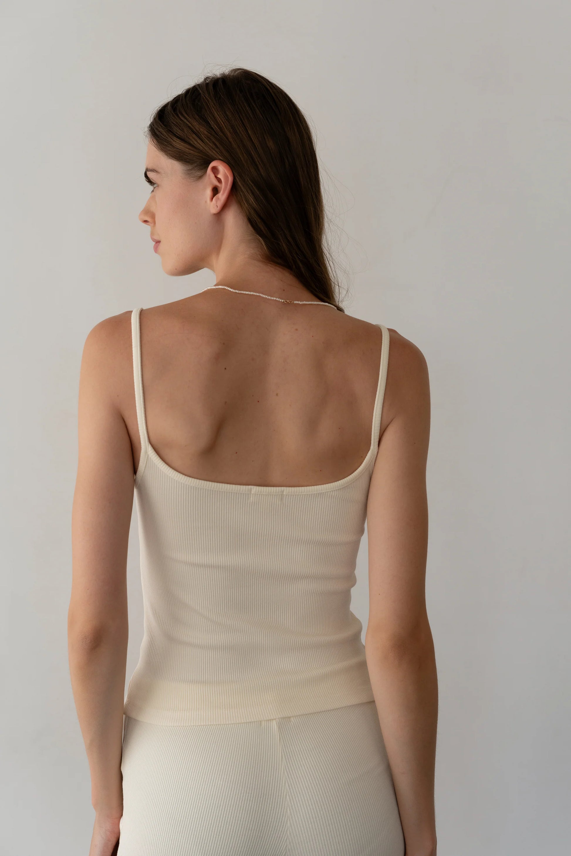 A year-round essential, effortlessly versatile for layering or wearing solo. Designed with a scoop neck, spaghetti straps, and a fine rib texture that provides the perfect amount of hold—no bra required.