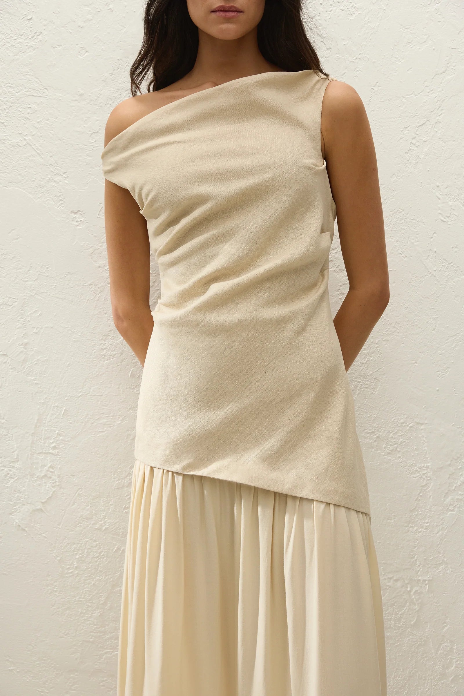 A unique maxi dress, designed from a signature 100% European Flax linen in a warm neutral. Featuring a sleeveless, asymmetric neckline, the bodice is softly fitted with subtle gathering through the sides for a more flattering fit. The silhouette also offers an asymmetric drop waist with a contrasting responsible rayon skirt. Gathered for a feminine touch, style with a simple sandal for summer occasionwear.