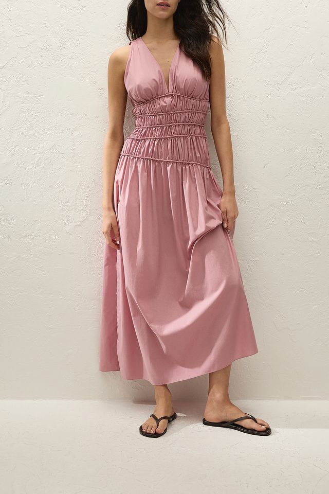 A vacation-inspired maxi dress, designed from a signature 100% cotton yarn-dyed in a dusty pink. It features a deep V-neckline through the front and back with an asymmetric elastic detail through the bodice for a cinched silhouette. From the waist it flared into a softly gathered A-line skirt. Style with a simple sandal for sun-drenched vacations.