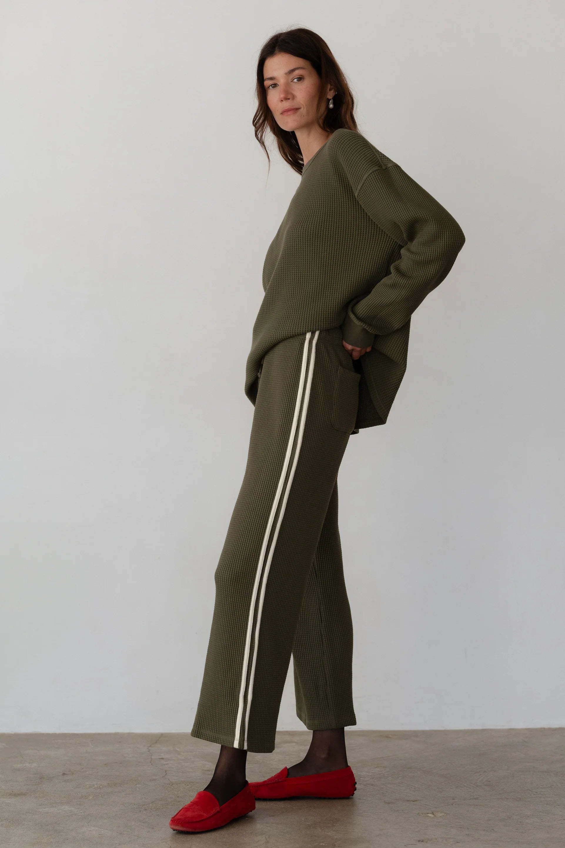 The Thermal Crop Stripe Pant is crafted from soft, breathable thermal with a textured waffle finish. Designed with a cropped silhouette, double stripe detail, and an adjustable drawstring waistband.