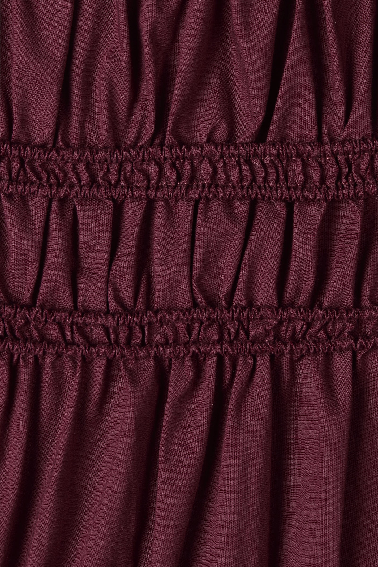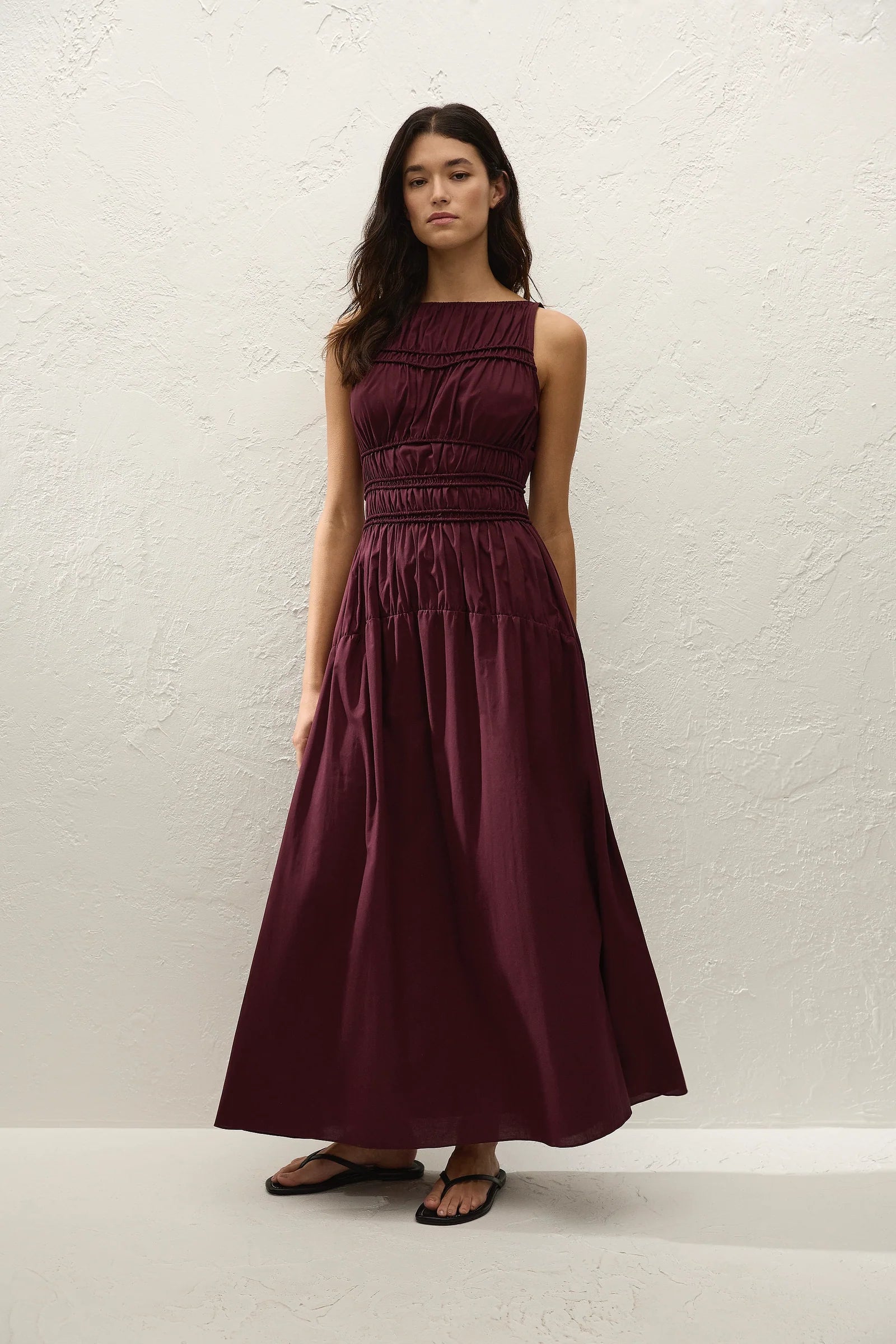 An effortless midi dress, designed from a signature 100% BCI Certified organic cotton, yarn-dyed in a deep mulberry shade. Sleeveless with a boat-style neckline, it offers a shirred bodice with cord elastic detailing for a more flattering finish. There is a subtly gathered drop waist that falls into a soft A-line skirt, cropping just above the ankles. With an ease of wear, style for transeasonal occasions.